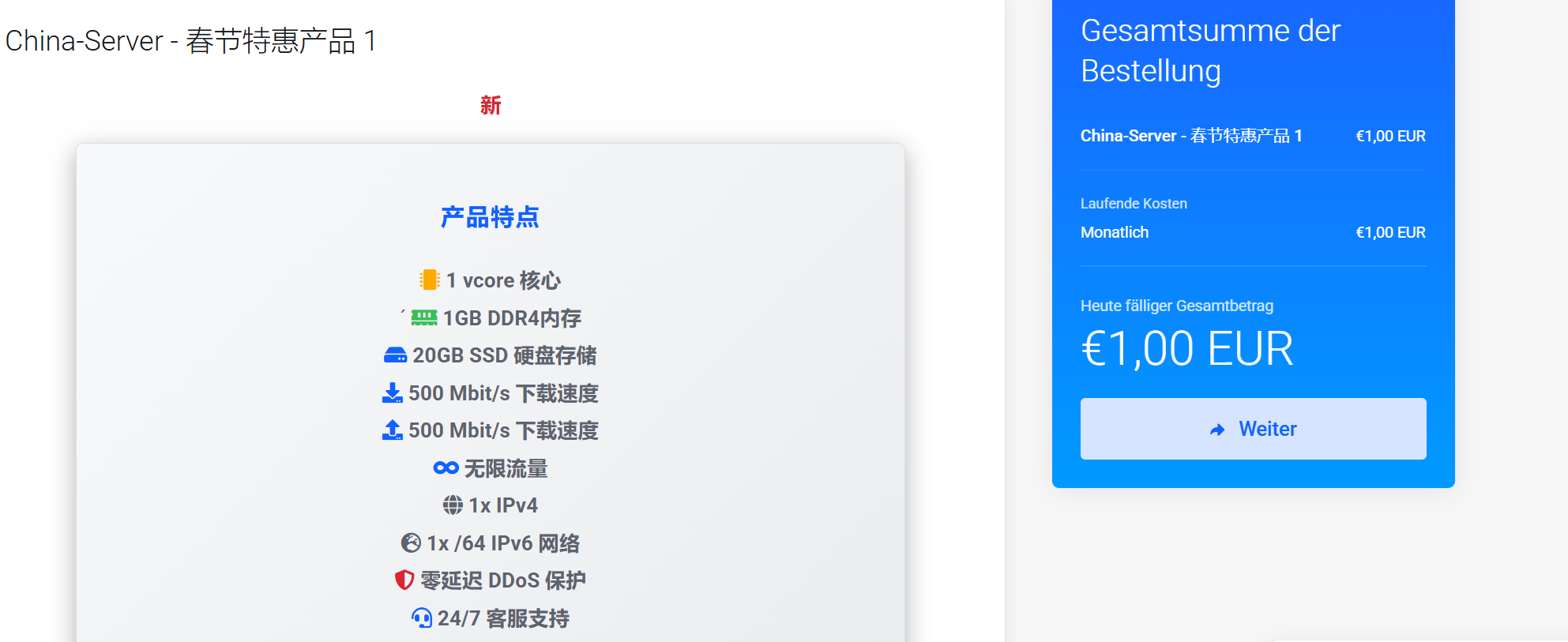 来自MYPREPAID SERVER的最低套餐1美金每月,1核心cpu,1g内存,20GB磁盘,上下行都是500M,+1ipv4+1ipv6,无限流量,这是比较少见的,喜欢的伙伴们可以下手