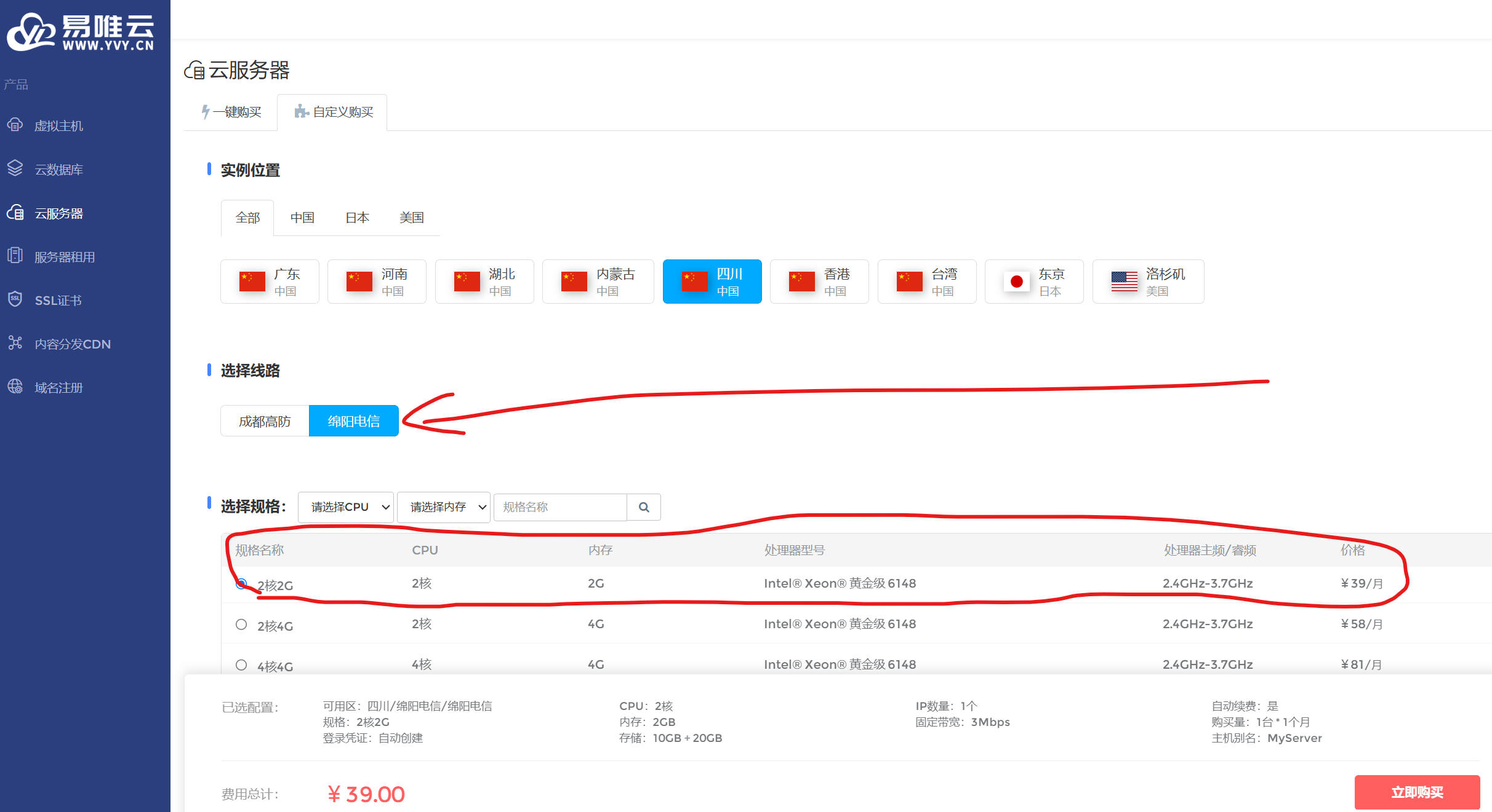 | 易唯云 | 服务器托管、租用 | 绵阳IDC机房vps最低套餐【2H2G3M/39元每月】 | https://www.yvy.cn/server/purchase |